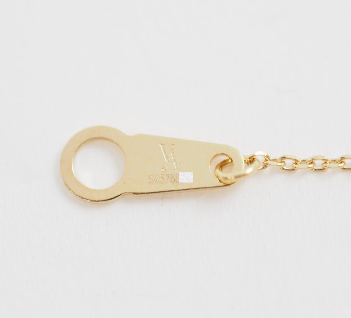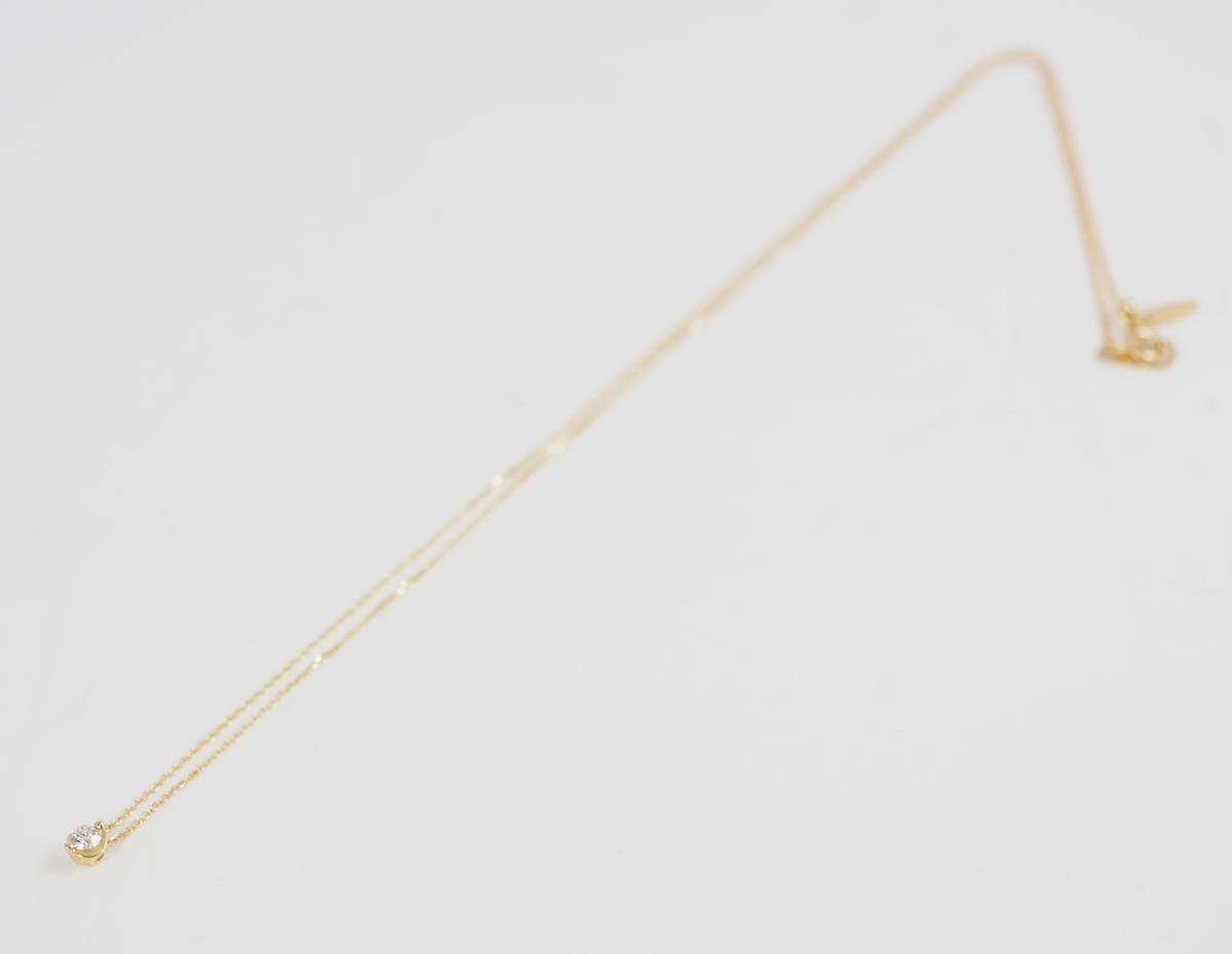 A single diamond necklace with the ultimate in simple beauty. Yellow gold elegantly and gorgeously envelops the sparkle of diamonds. It also comes with a slide ball, so you can freely adjust the length of the chain.