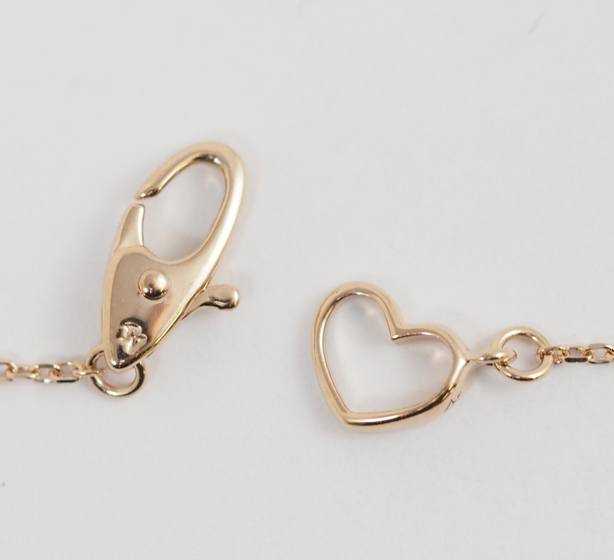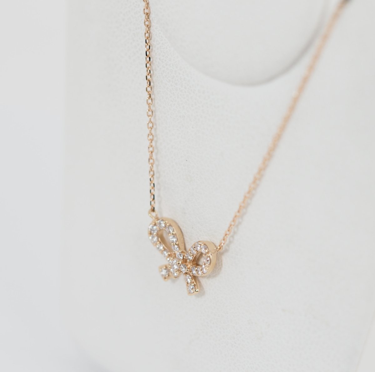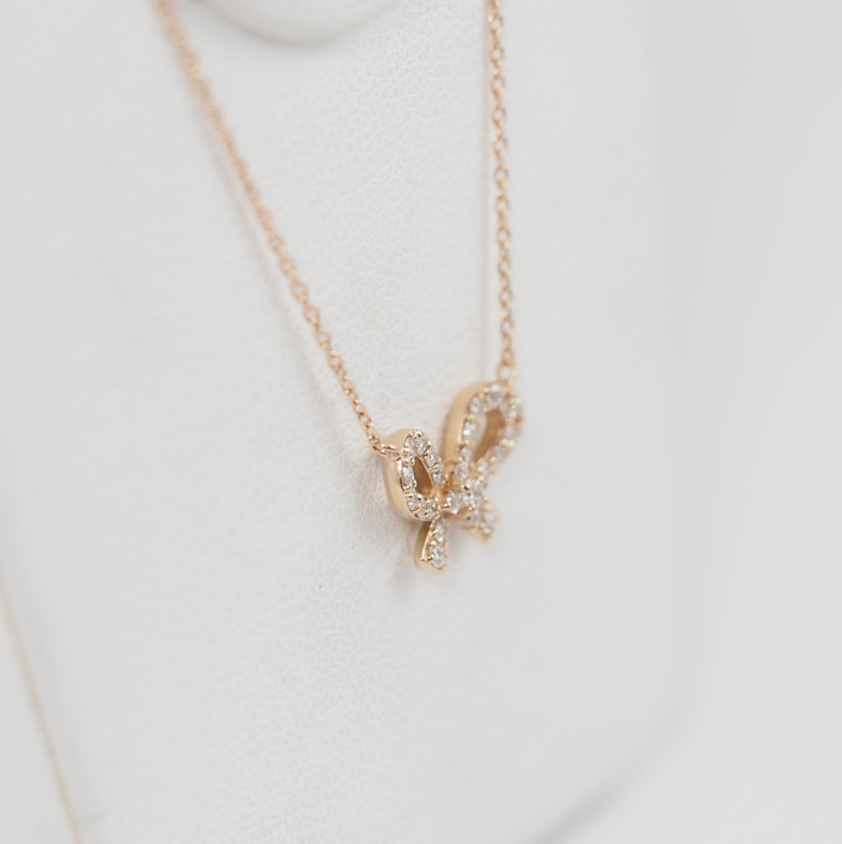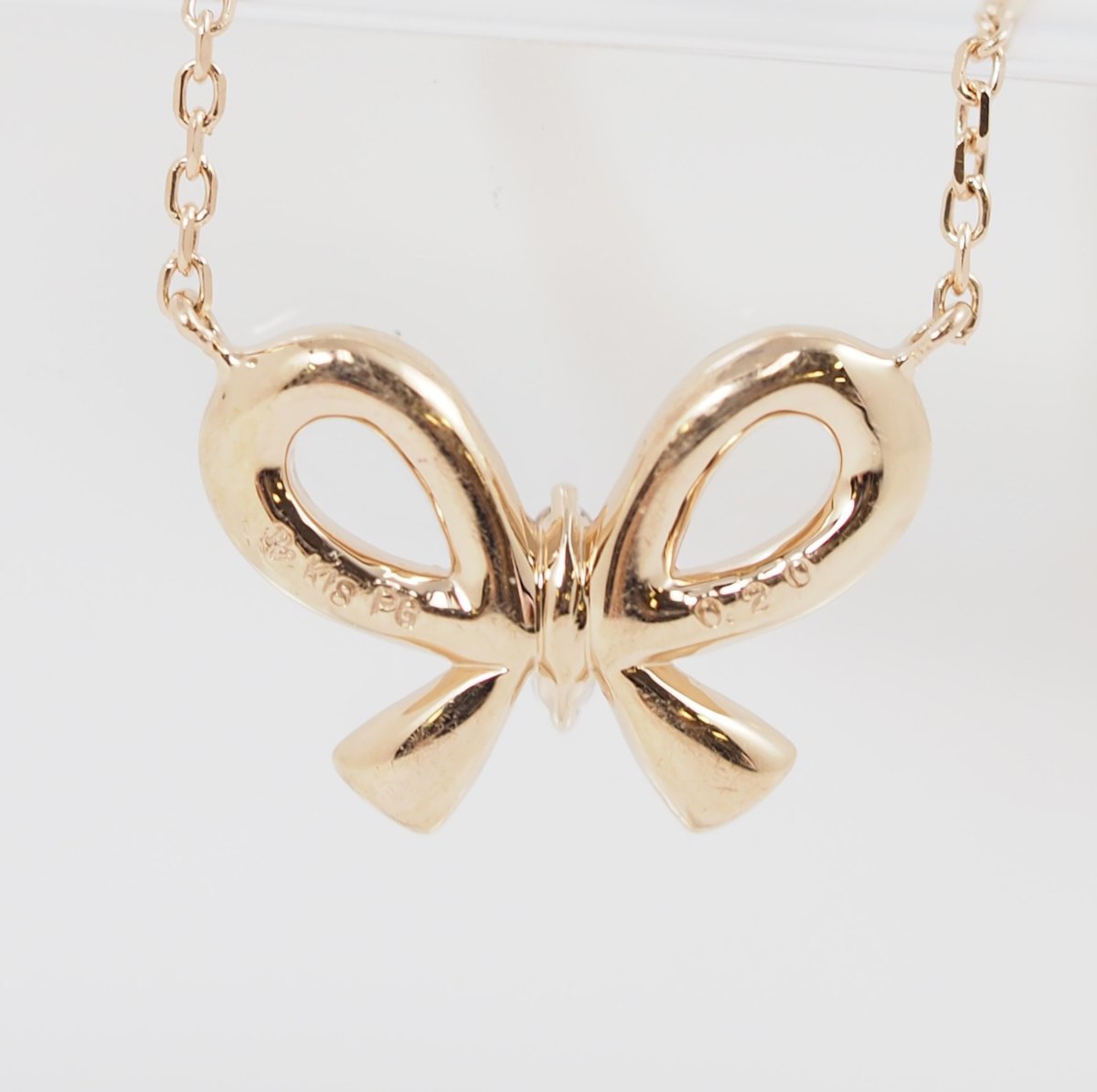 A ribbon necklace luxuriously decorated with diamonds in 18K pink gold that blends well with your skin. The ribbon motif, which tends to be sweet, has a sophisticated and mature cute atmosphere that is unique to Ponte Vecchio. It has just the right amount of volume and makes your chest look gorgeous.