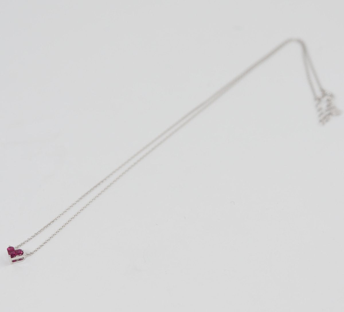 Star Jewelry's signature necklace from the popular "Mysterious Heart" series. The main point is the heart shaped in an original setting, which is finished with three stones without using nails for the outline. The 18K white gold adds elegance and elegance to the lovely yet passionate ruby heart. This jewelry can be used for a wide range of purposes, from everyday use to special occasions.