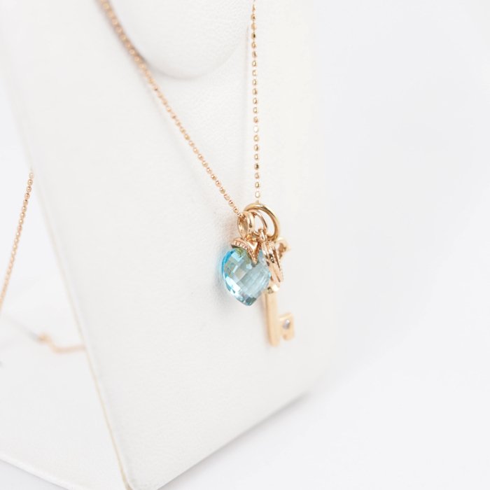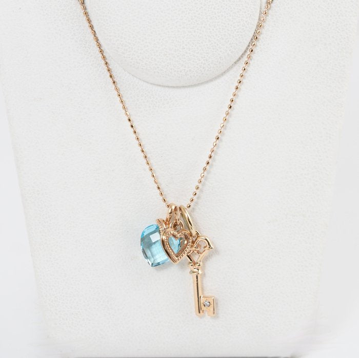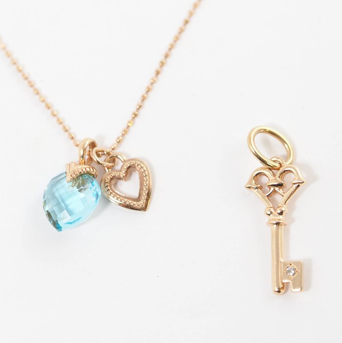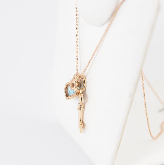 A necklace with a refreshing blue heart and an elegant milgrain heart with a key charm added. The key charm accented with the sparkle of a single diamond is removable. The K10 pink gold blends well with your skin and brings out your femininity.