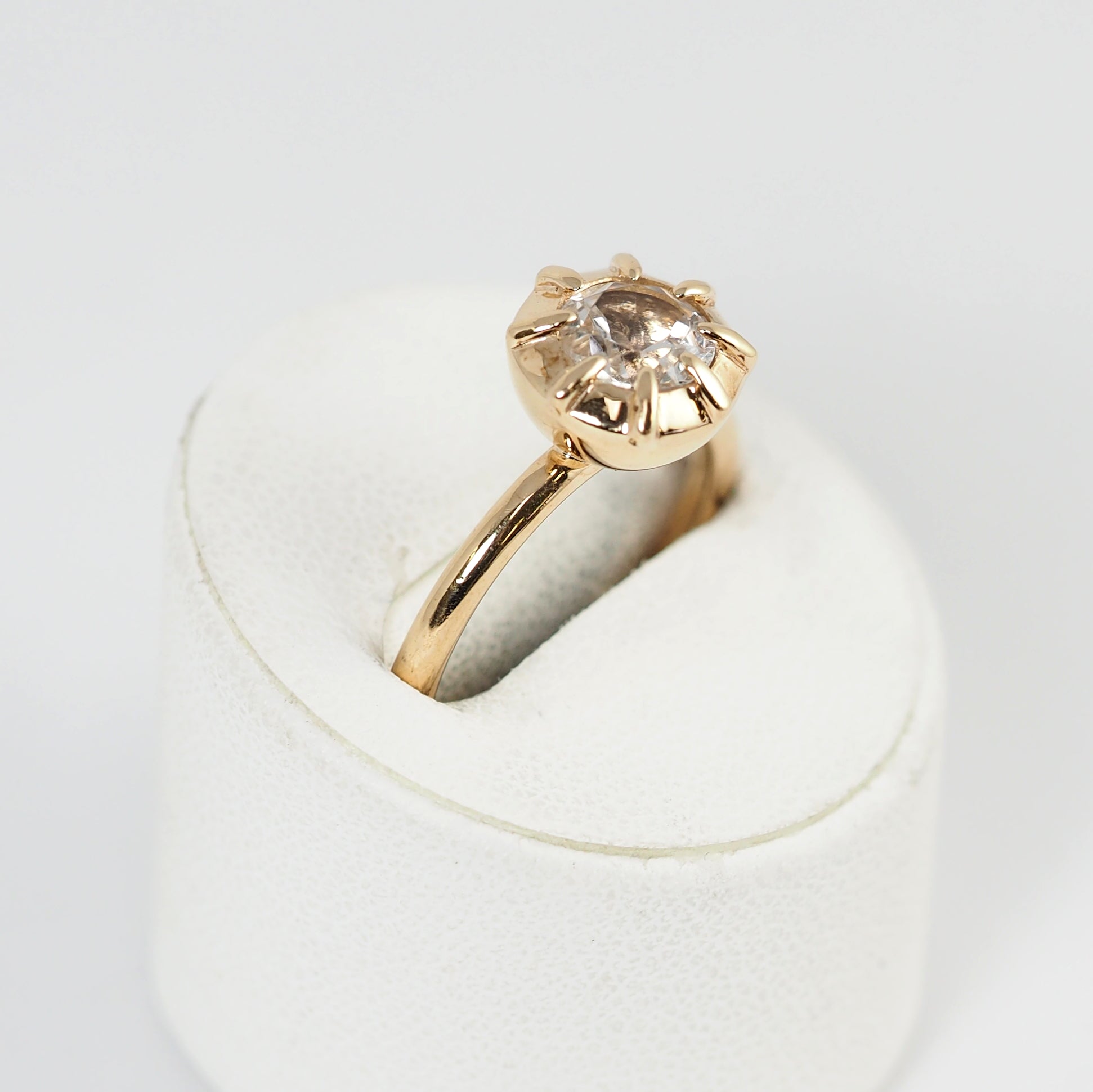 A ring that envelops a fresh clear stone in gorgeous yellow gold. The transparent clear stone blends well with the skin and can be used elegantly even with a bold design.