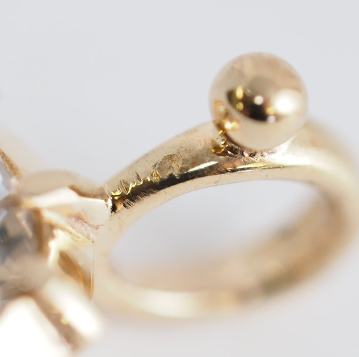 There are scratches on the ring and some small scratches on the base metal (yellow gold), but the clear stone is in good condition. Because natural materials are used, the size, color, texture, and shade may vary from piece to piece. There may also be inclusions or slight scratches. Please be aware of this in advance.