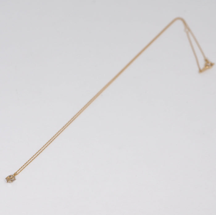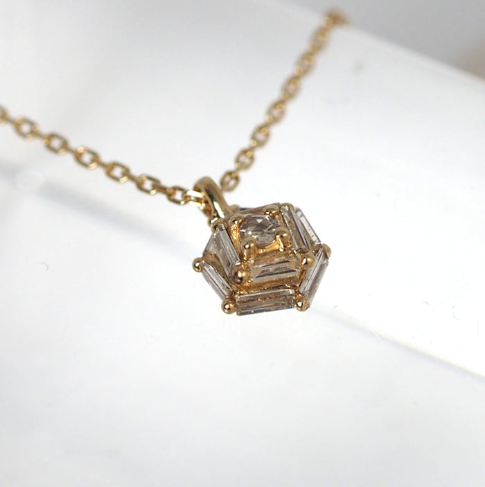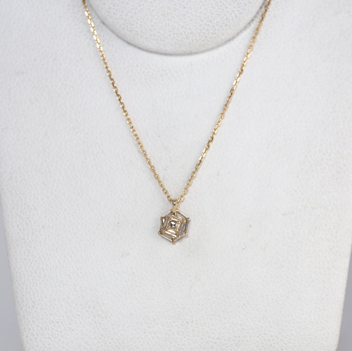 A luxe necklace with a soft and elegant sparkling rose-cut diamond surrounded by sharp square (baguette-cut) diamonds. Yellow gold adds a touch of glamor to the classic appearance unique to Agate.