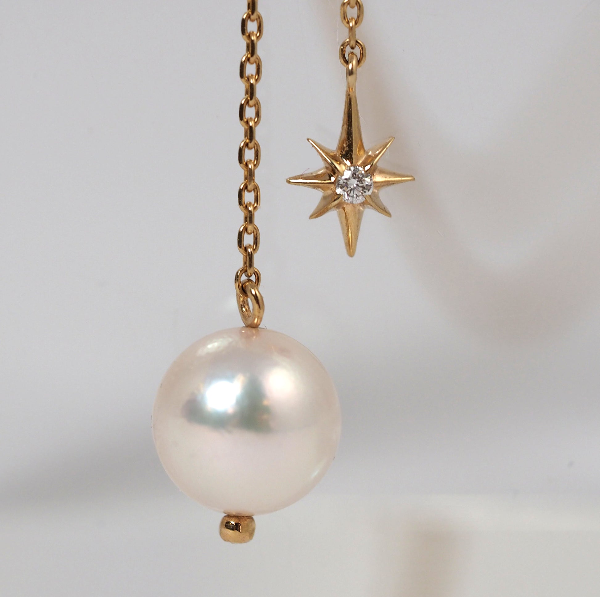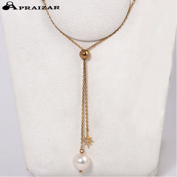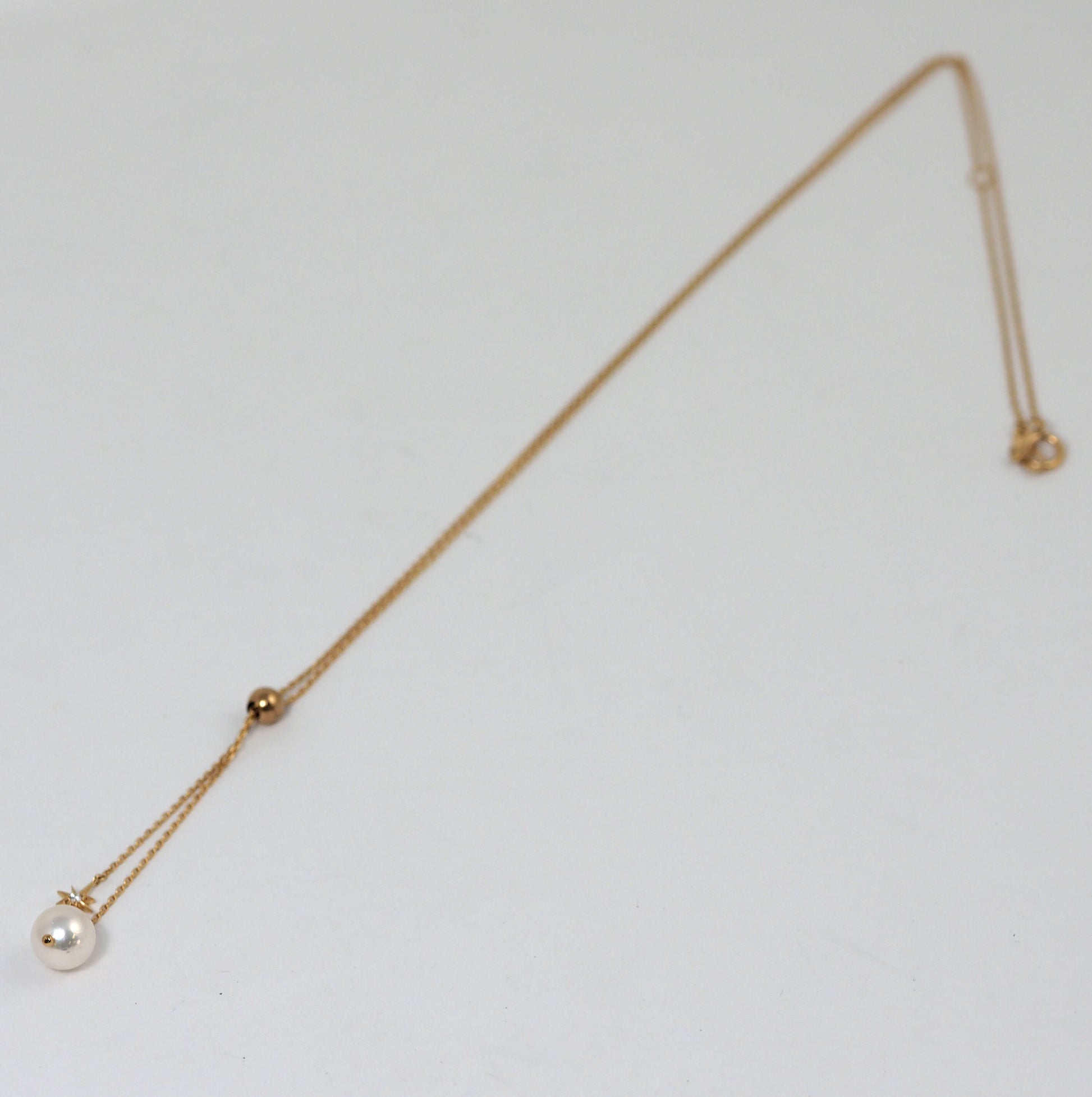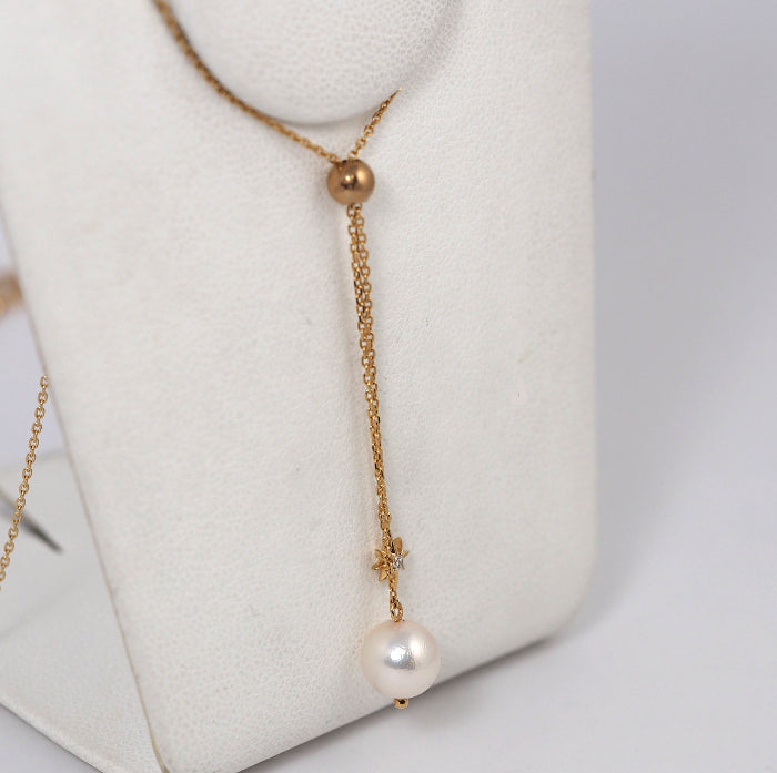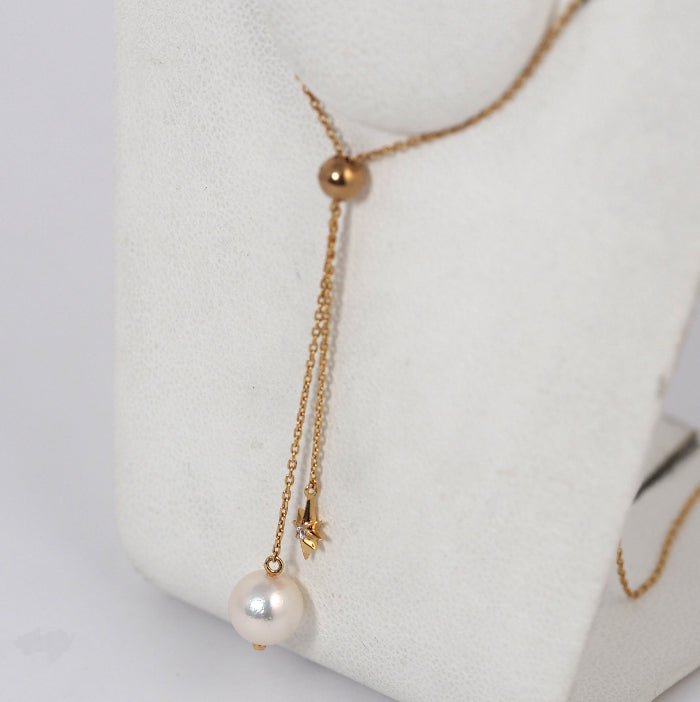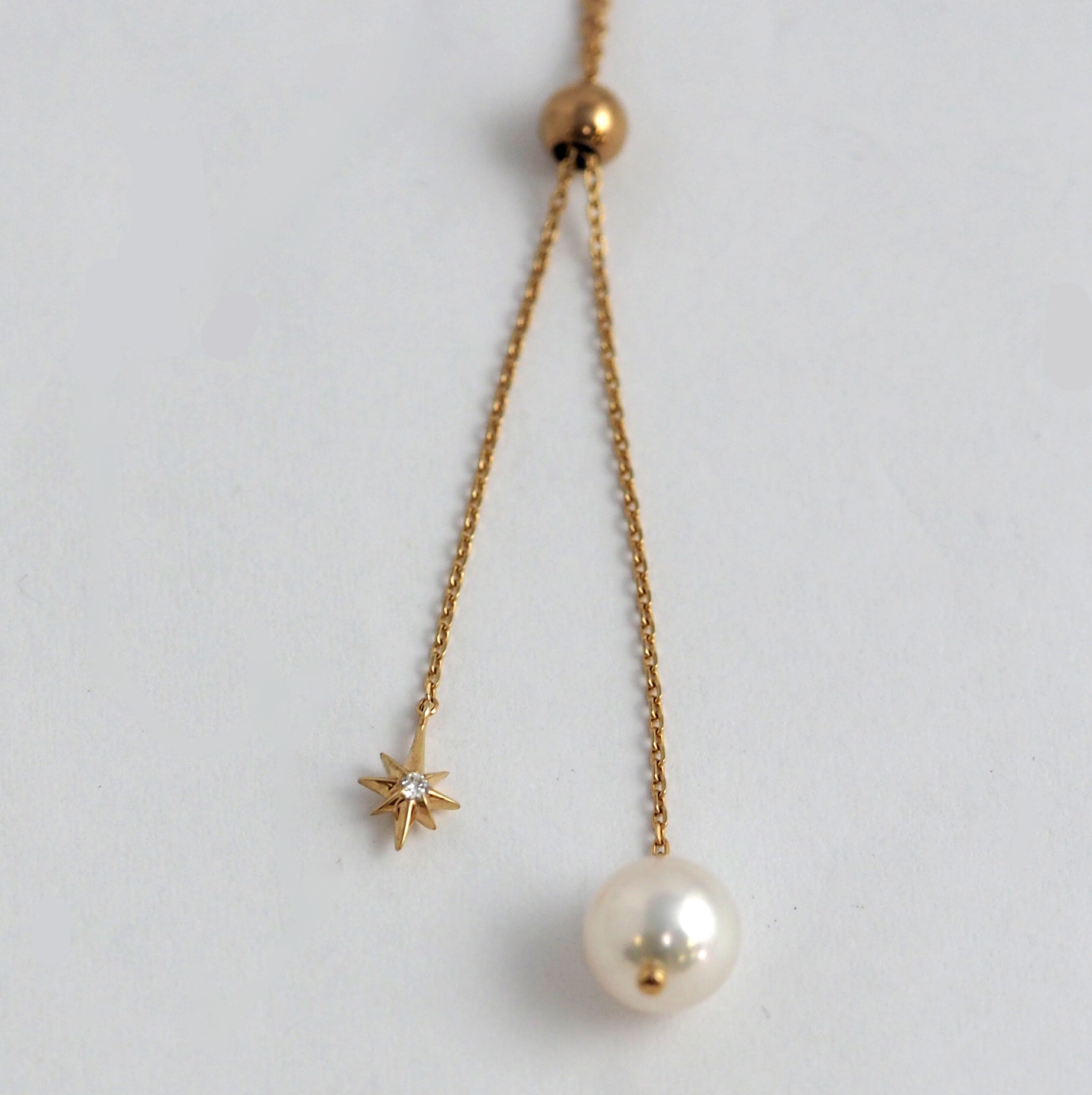 This gorgeous necklace features elegant pearls and a sparkling diamond crossing star. The pearls dangle from the chain end, which connects to a modern sliding ball, accentuate your femininity. The ball can be adjusted to your desired length!