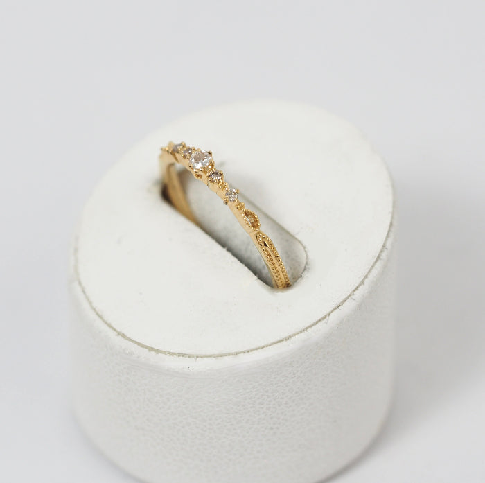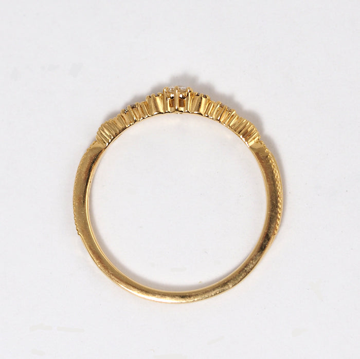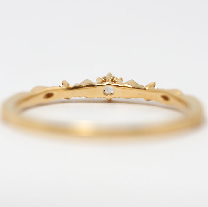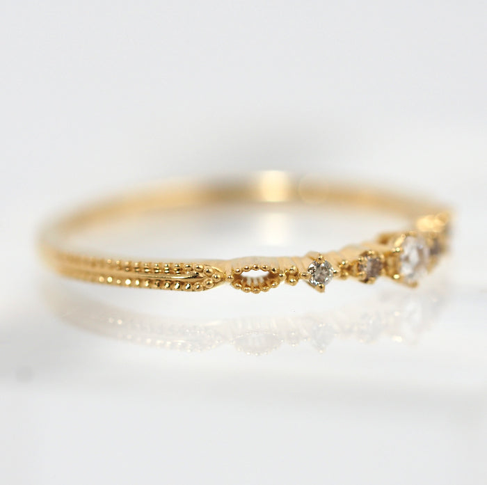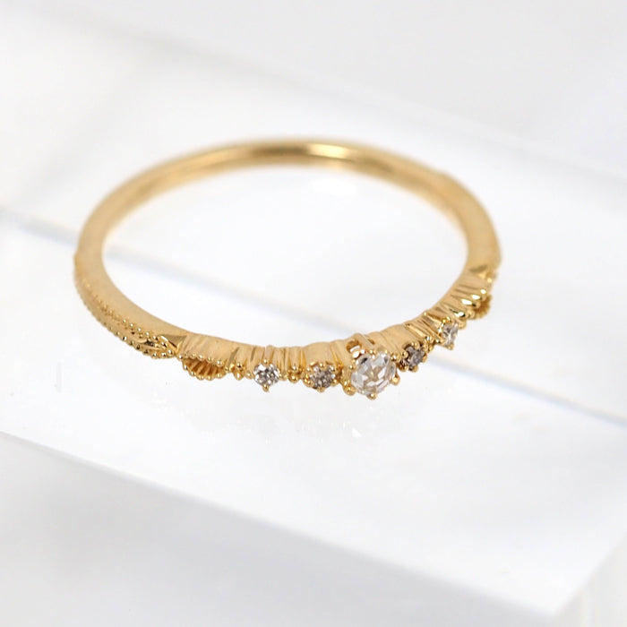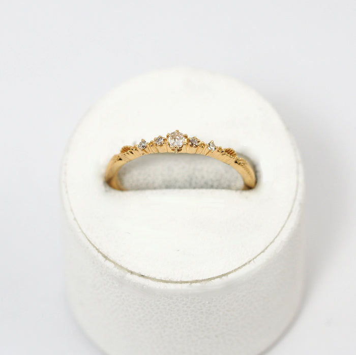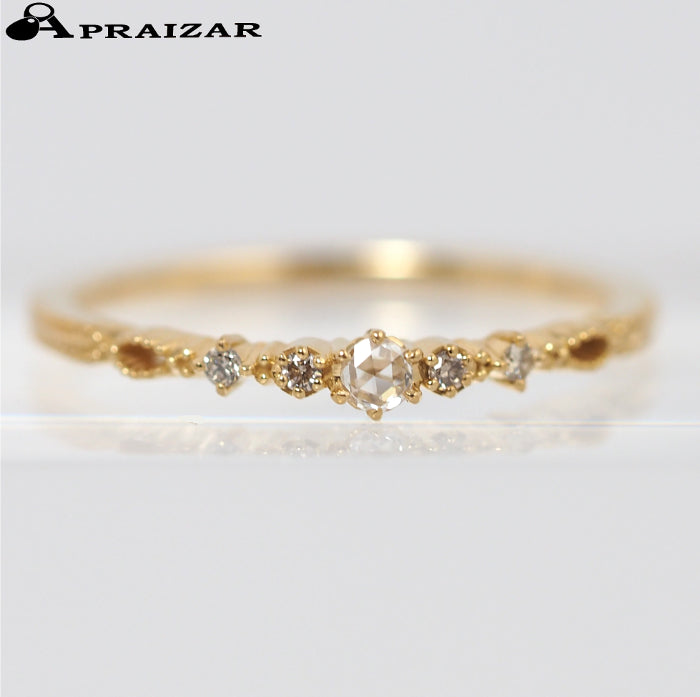 This gorgeous and elegant ring features a classical transparent rose cut diamond and four brilliant cut diamonds. The height difference between the stone setting and the base on both sides gives the ring depth and rhythmic feel around the finger.