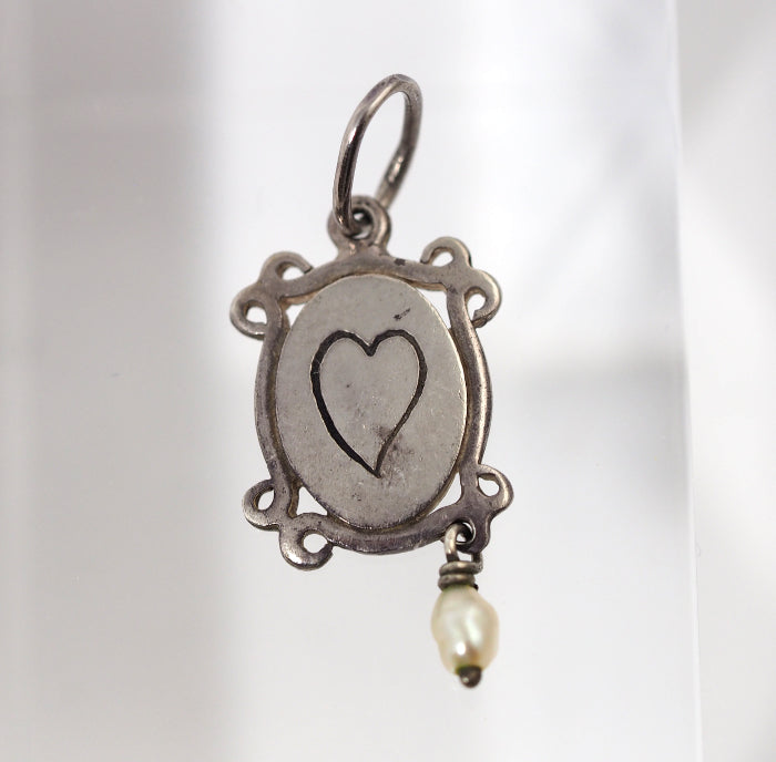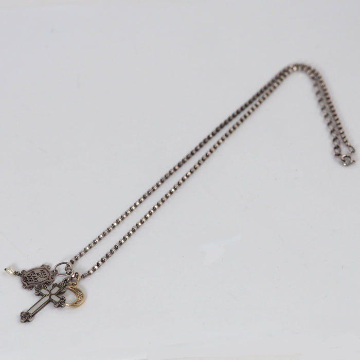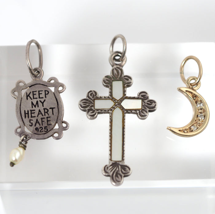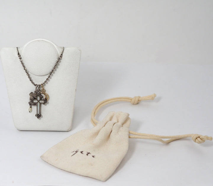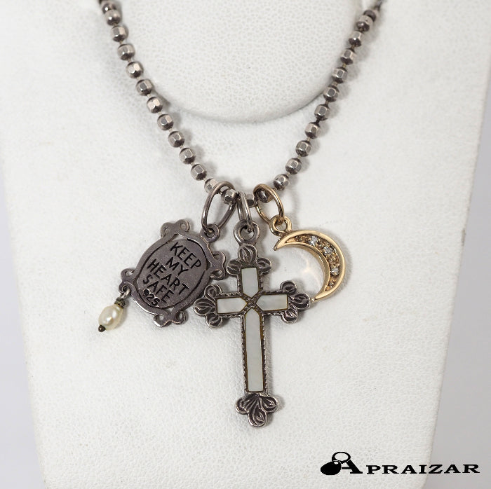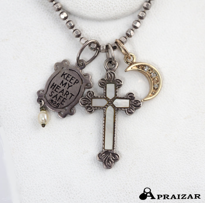 This necklace features a diamond-studded crescent moon, a cross encased in shells, and a cute plate with baby pearls and a heart. The silver adds a vintage touch to the sophisticated charms unique to Agate. Each charm is removable, allowing you to match it with your outfit of the day.