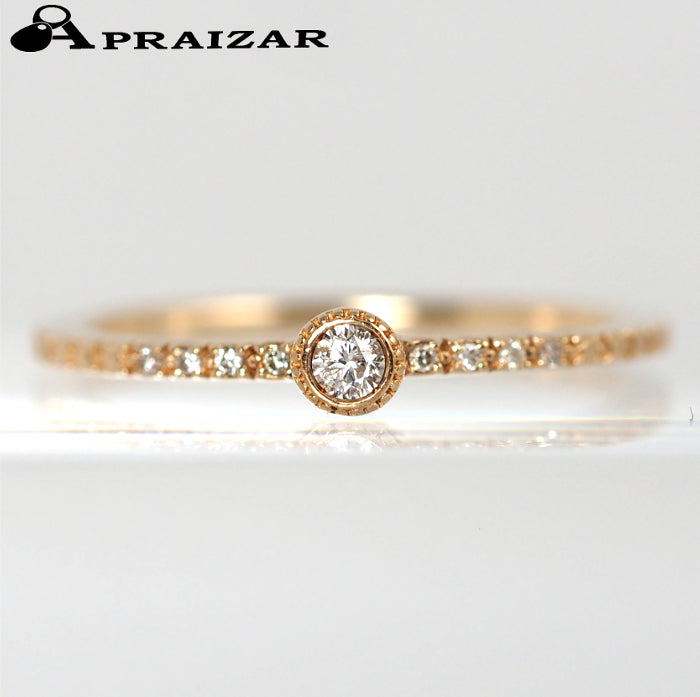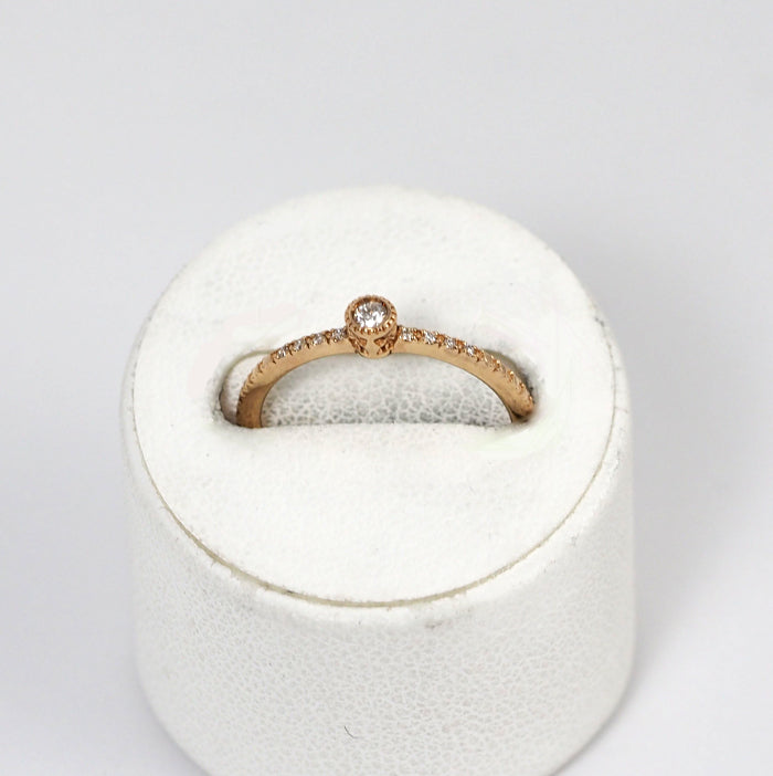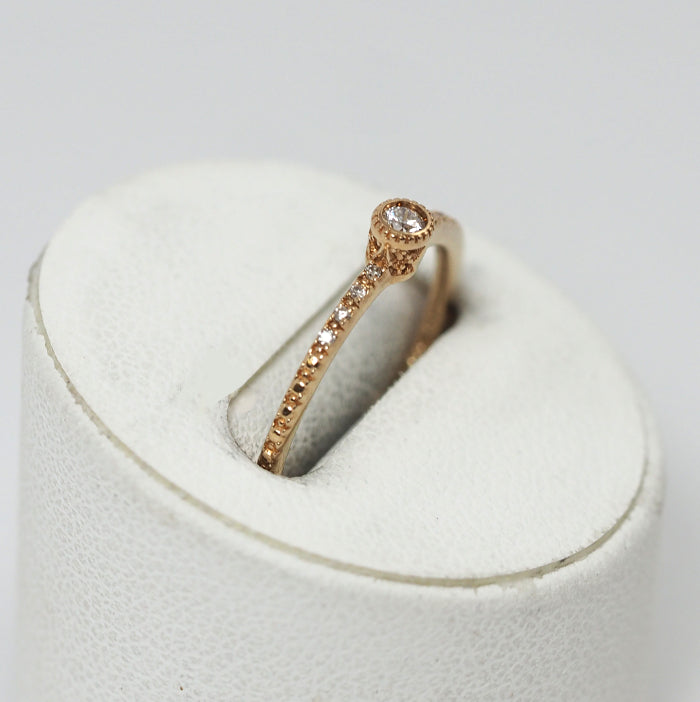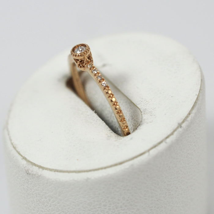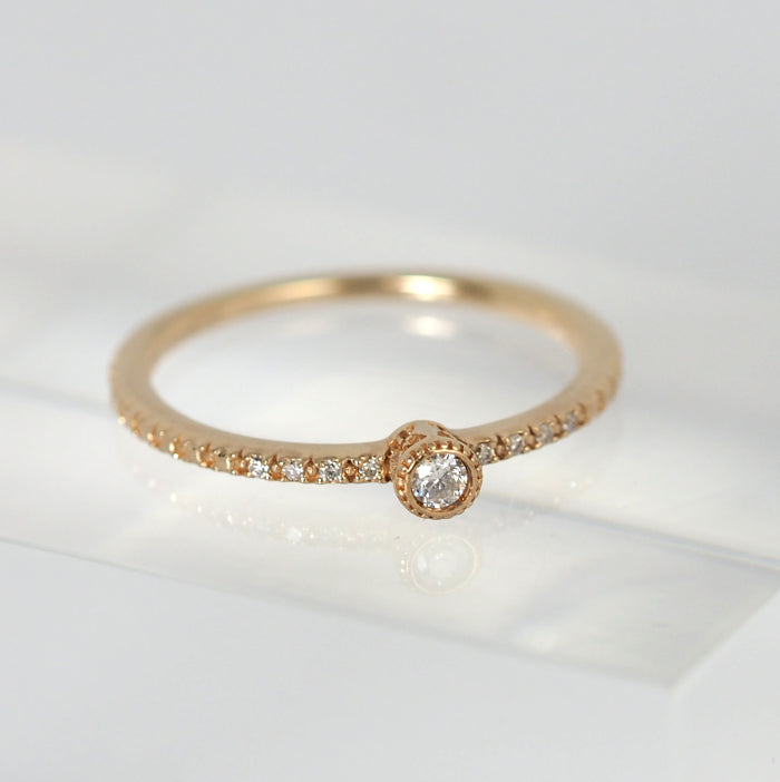 This elegant ring features a single diamond with sparkling side diamonds. The center diamond is surrounded by mills, creating a classic design that makes a subtle statement. It brings out femininity with a gorgeousness that is different from a single diamond.
