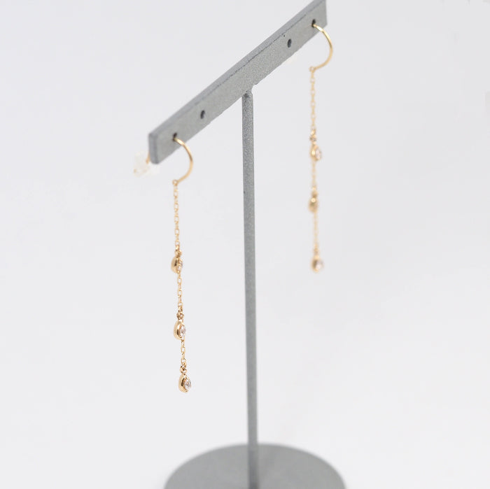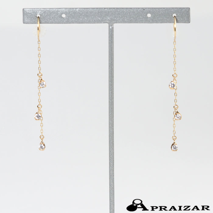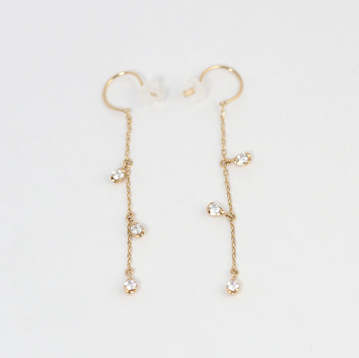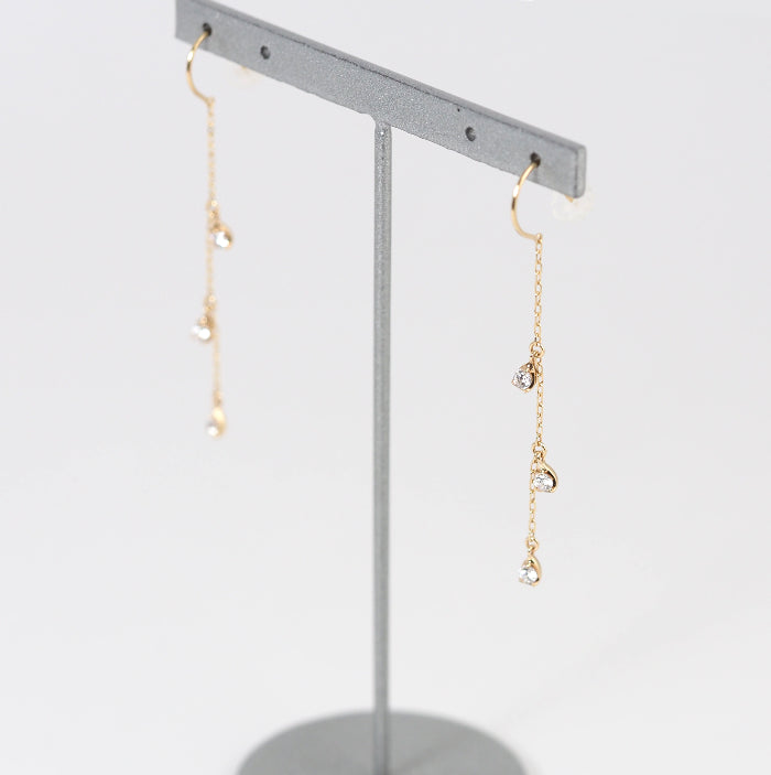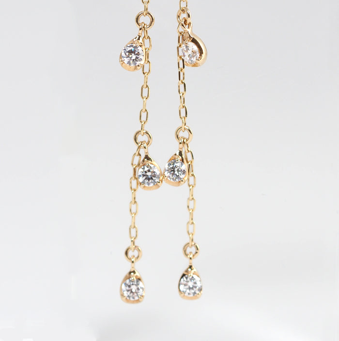 These earrings feature a gorgeous yellow gold chain with sparkling, transparent zirconia. The vertical lines create a clean profile and accentuate your femininity with every sway.