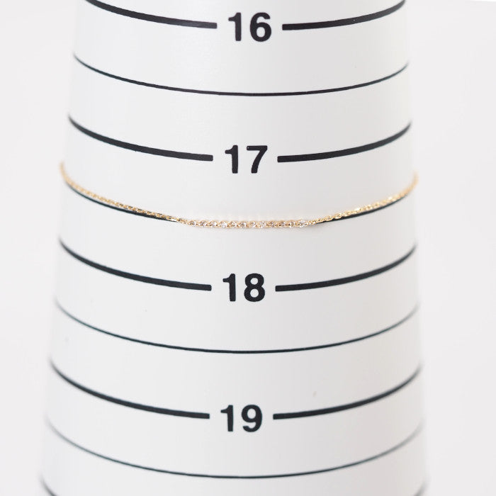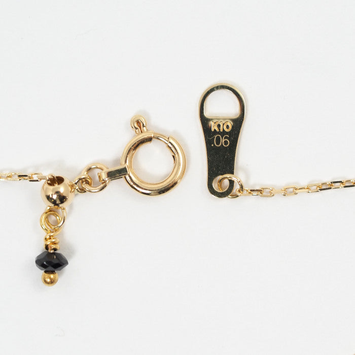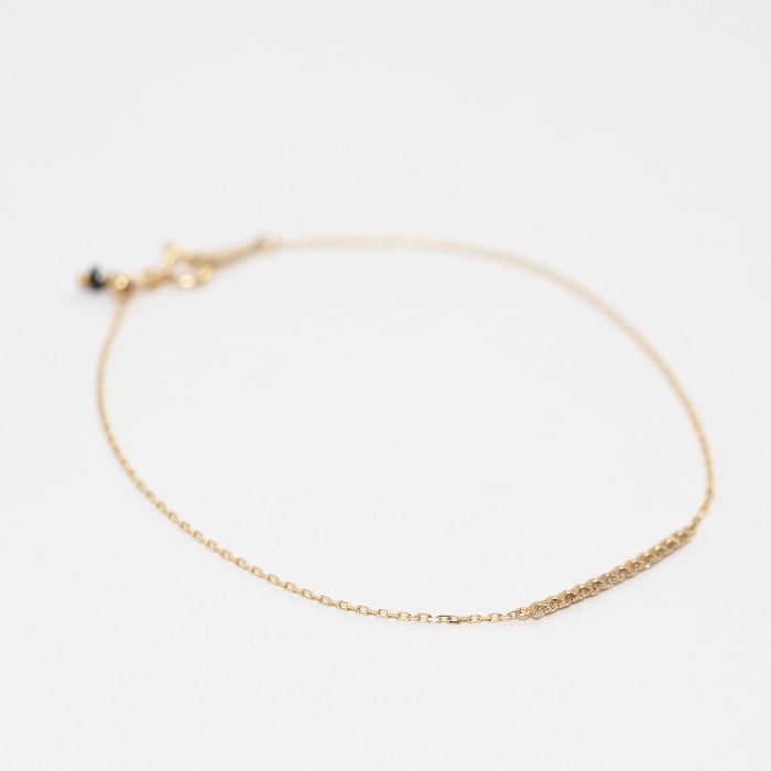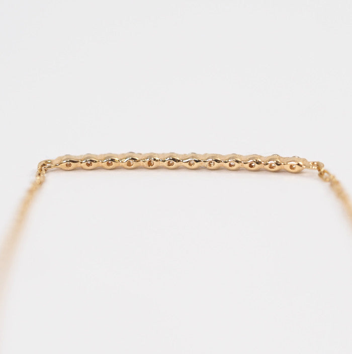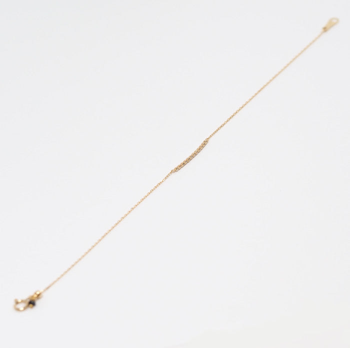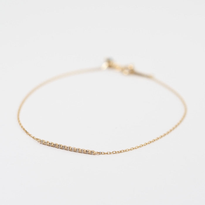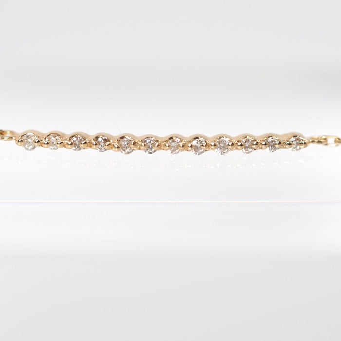 This bracelet features a beautiful lane-like line, with delicate diamonds strung in a straight line against gorgeous yellow gold. The diamonds and the metal appear to blend seamlessly into the skin, yet the diamonds subtly sparkle against bare skin. The stripped-down, simple design complements any style of fashion and can be worn daily.