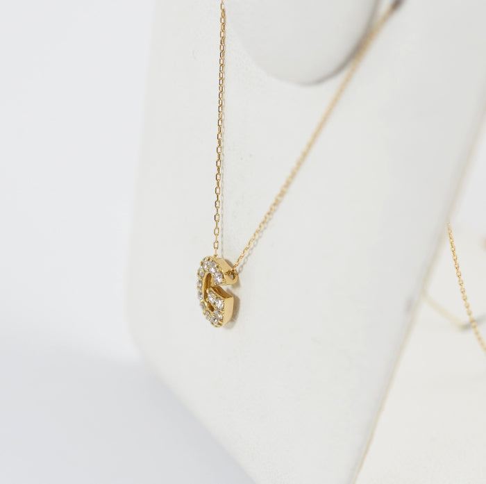 ダイヤの煌めきが美しい“Premiere Etoile(一等星)の輝き”をテーマにしたイニシャル「G」のネックレス。溢れる輝きがモチーフから零れ落ちていくような、甘く柔らかな光の表情を引き出すため、地金の露出を最小限に抑え、ダイヤの位置に高さをもたせた、繊細なセッティングを施しています。また、モチーフの面が緩やかにカーブしていることで、光が全方位に広がり、奥行きのある、立体的な輝きが感じられます。