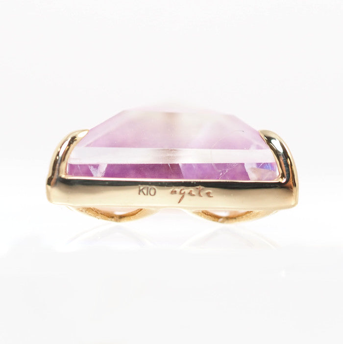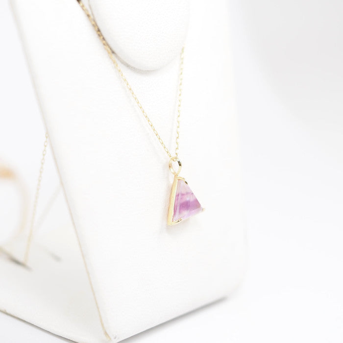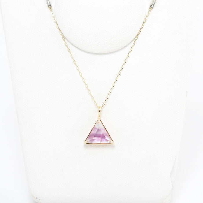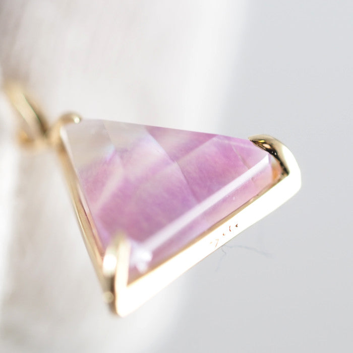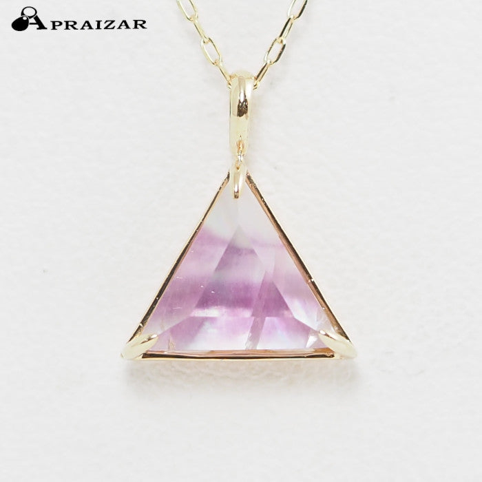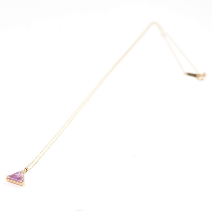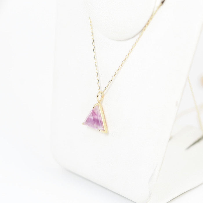 グラデーションが美しい紫のカラーストーンと上品なホワイトシェルをリバーシブルに楽しめるネックレスです。モダンなトライアングルモチーフにイエローゴールドが華やぎを添えてくれます。