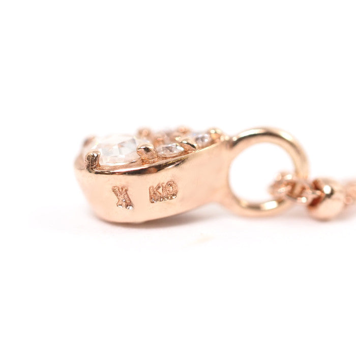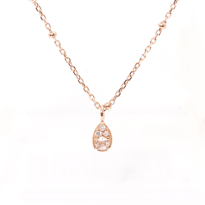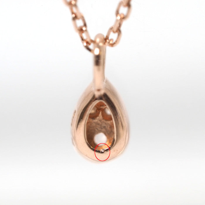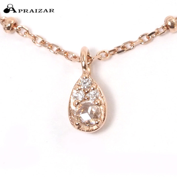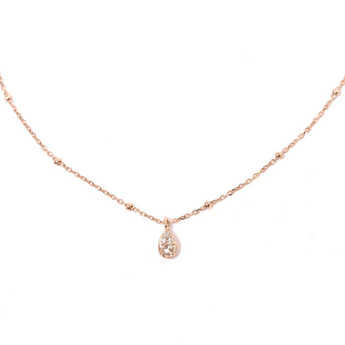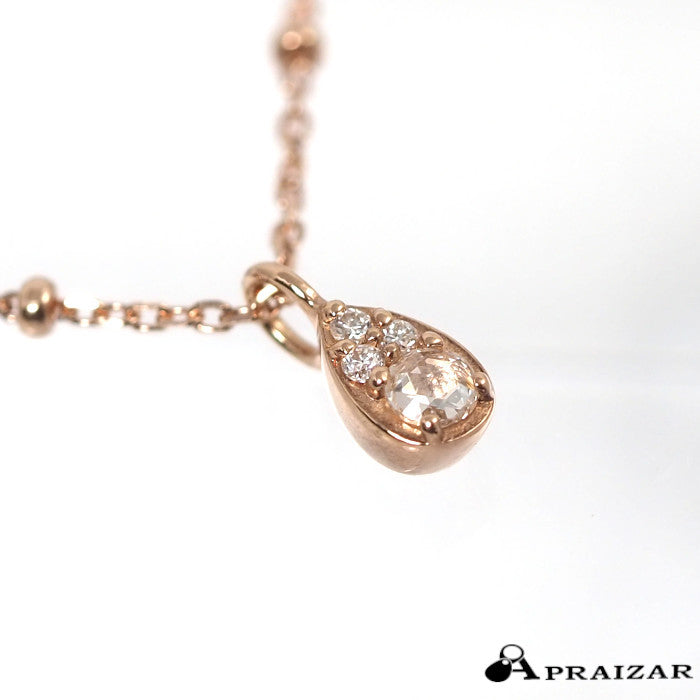 コロンとした雫のフォルムにダイヤが煌めくネックレス。繊細でありながら3粒あしらわれたメレダイヤがさらなる煌めきをプラス。肌なじみのよいピンクゴールドのチェーンにあしらわれたボールモチーフがアクセントとなり胸元を上品に演出してくれます。